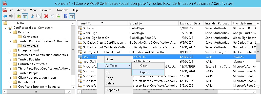 1. Navigate to the Trusted Root Certificate Authorities/Certificates folder.