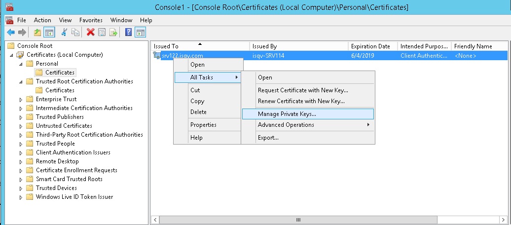 2. In MMC using the Certificates snap-in, select the certificate installed above, right-click, and choose Manage Private Keys from the context menu.