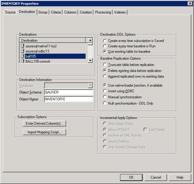 2. Modify the subscription: On the Destination panel, choose Use Existing table for baseline and Use native-loader function (or Insert using ODBC, as desired). The Other options remain at Delete existing data before replication and Allow UPSERT.