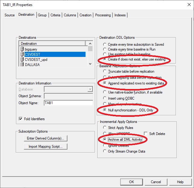 Create (table) if does not exist; else use existing - Baseline Replication Options should be