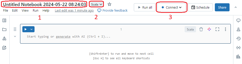 2. Enter a name for the notebook (1), select the Default Language as Scala (2), and select the newly created cluster (3).