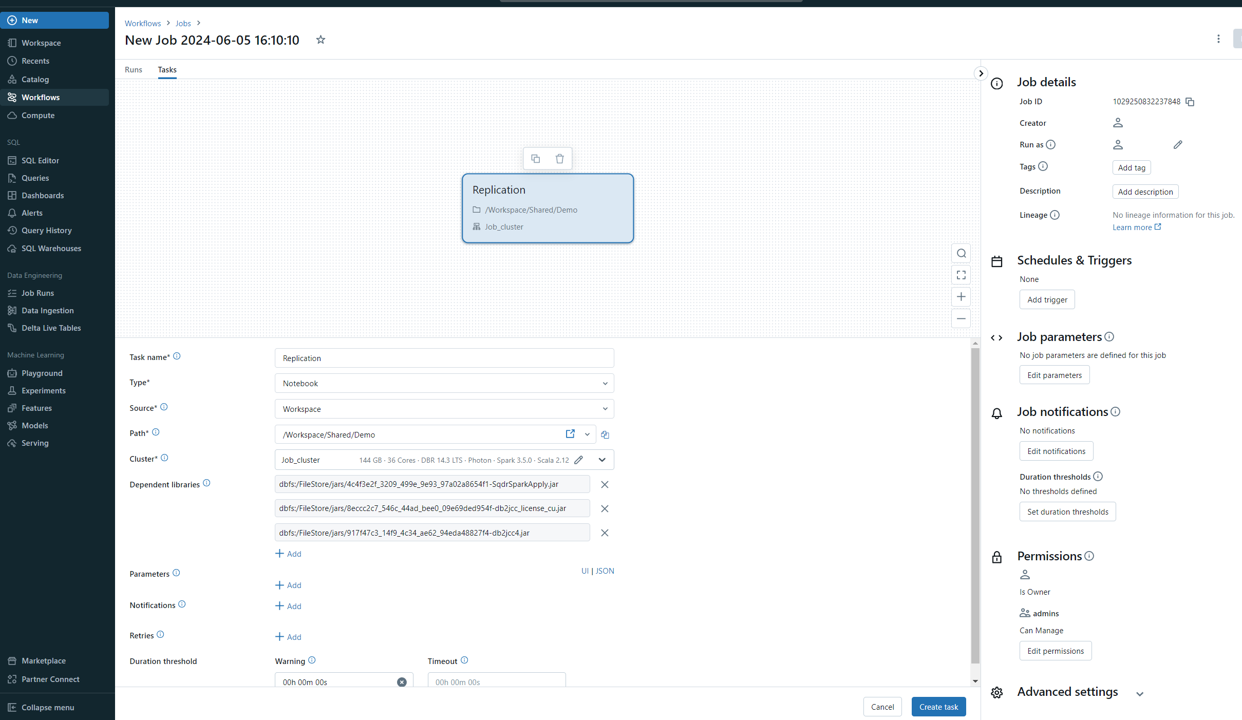 To replicate data into Databricks, a workspace and a cluster must be created. For more information on how to create a Databricks workspace and cluster, refer to Databricks setup.