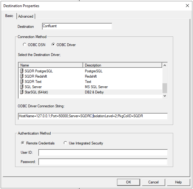 3. Enter the credentials of the sqdr user and then select the Advanced tab. The connection will be successful if the Advanced panel is viewable.