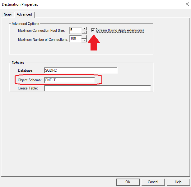 4. On the Advanced panel of the destination, select the checkbox Stream (Using Apply Extensions) and set the Object Schema to CNFLT.