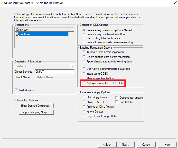 Repeat steps 1 - 5 to recreate the subscription(s). However, upon step 3 change the Baseline Replication Option from Null Synchronization - DDL Only to Use native-loader function