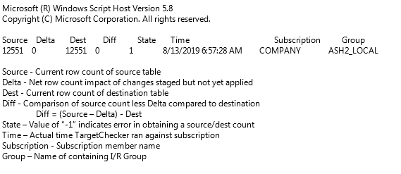 Targetchecker.vbs is a Visual Basic script which can be run from a command prompt to obtain row count statistics for source and destination tables of incremental subscriptions. The script is used to verify that the number of rows in the source table match the number of rows in the destination table. For best results, the script should be run when database activity is at a minimum.
