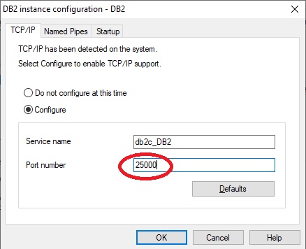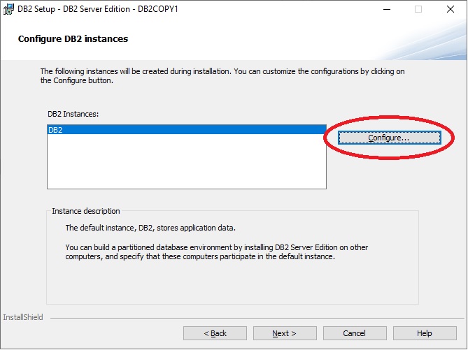 - On the Configure DB2 Instances panel, click the Configure... button and verify that the TCP/IP Port number is 50000. If you are installing Db2 LUW 11.5.6 and later as a new install, this value will be 25000 and should be changed to 50000. If the value differs because another product is using port 50000 or a previous installation of Db2 was not completely removed, examine the etc/services file to investigate and address the port conflict.
