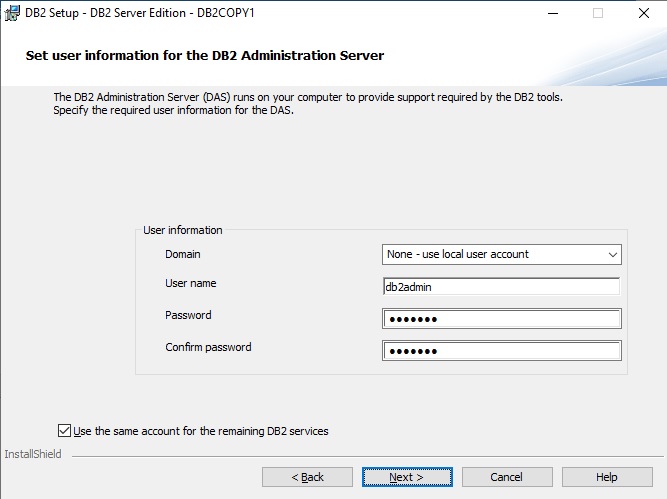 - Leave the checkbox Use the same account for the remaining Db2 services enabled.