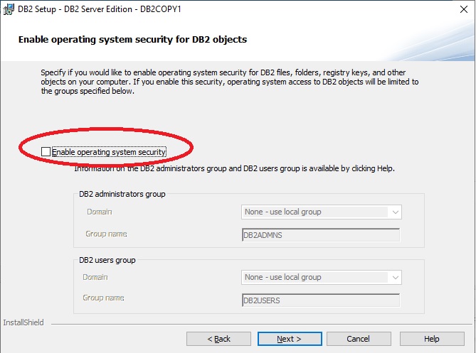 - On Enable operating system security for Db2 objects, unselect the checkbox Enable operating system security.