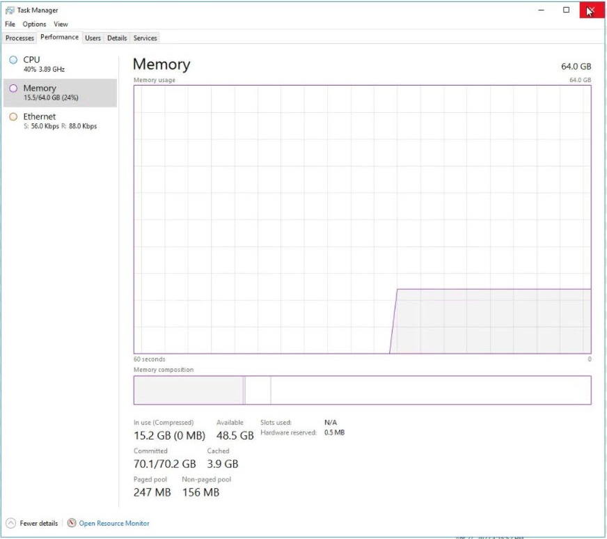 - Examining the memory usage in Task Manager revealed that although actual memory utilization was low (24% - ~16gb of 64gb), the Committed memory was at capacity (70.1/70.2 GB)