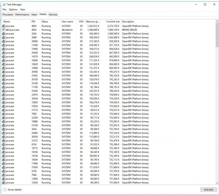 - Examining Details in Task Manager revealed that there were many java processes using only a portion of their Commit size memory - i.e. each java process had Commit size of ~800kb-1gb, even though most had actual memory usage in the area of 128kb.